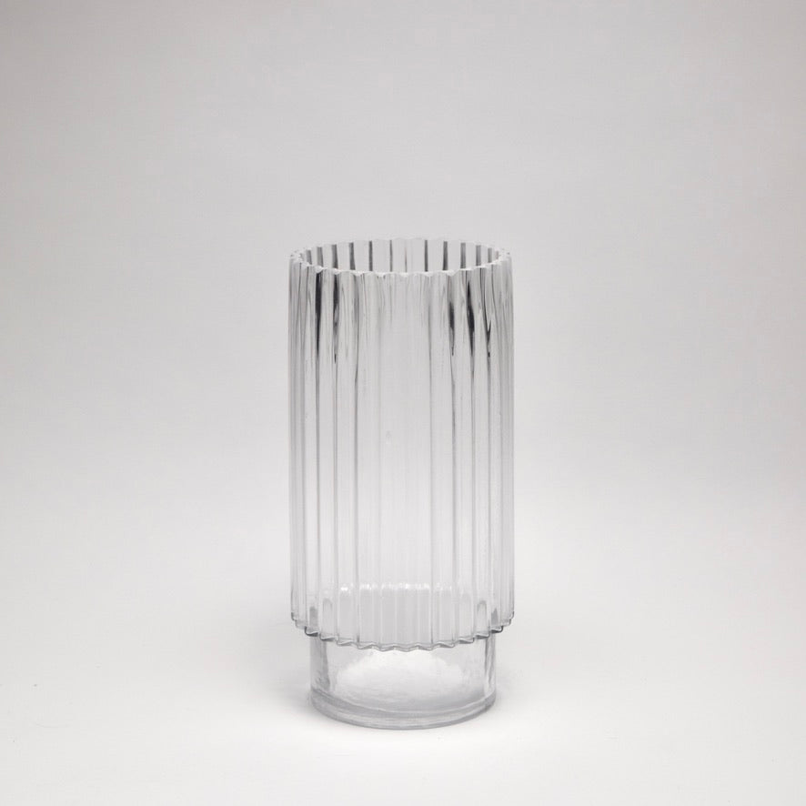The stepped base of the vase is plain glass, creating a pedestal effect and contrasting with the dramatic vertical ridging of the body of the vase.