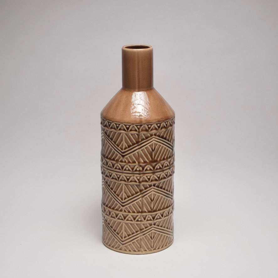 The Aztec pattern is raised, adding texture and interest, contrasting with the smooth neck of the vase.