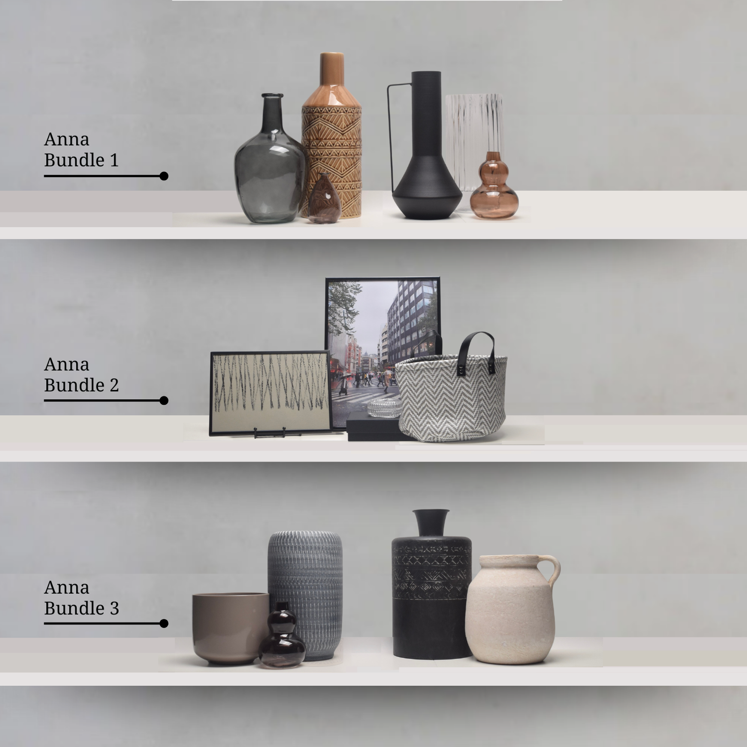 A bundle is a group of items, designed to sit together on one shelf. Some bundles are styled to work well as a top shelf (these are numbered 1 in their bundle name), some are styled to work well as a middle, eye-level shelf (numbered 2), and some styled to work well as a shelf near the bottom (numbered 3).