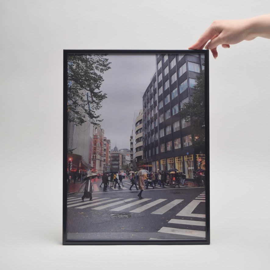 This bustling urban cityscape image was taken on a rainy day in the Spanish city of Bilbao. The scene has lots to look at - with the zebra crossing creating a bold pattern in the bottom third, pedestrians holding umbrellas along the horizon, and buildings and trees which frame the scene. The photograph is printed on high-quality 200gsm paper.