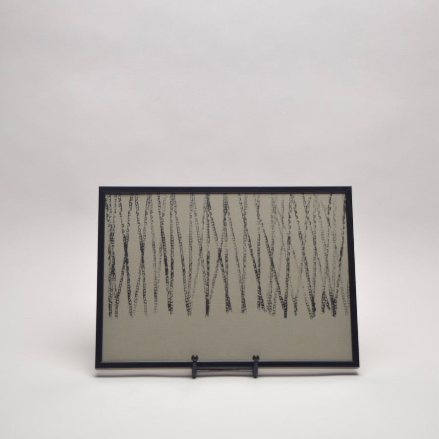 A series of intersecting diagonal lines have been handprinted onto linen textured neutral 216gsm paper. The lines create a visual rhythm with an overall effect that is minimal yet dynamic.