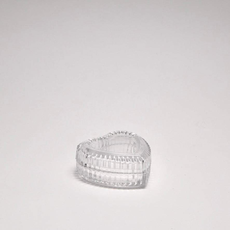A charming glass dish with lid, the glass has intricate ribbed detailing around the borders of the heart shape. Both attractive and useful for keeping small trinkets.