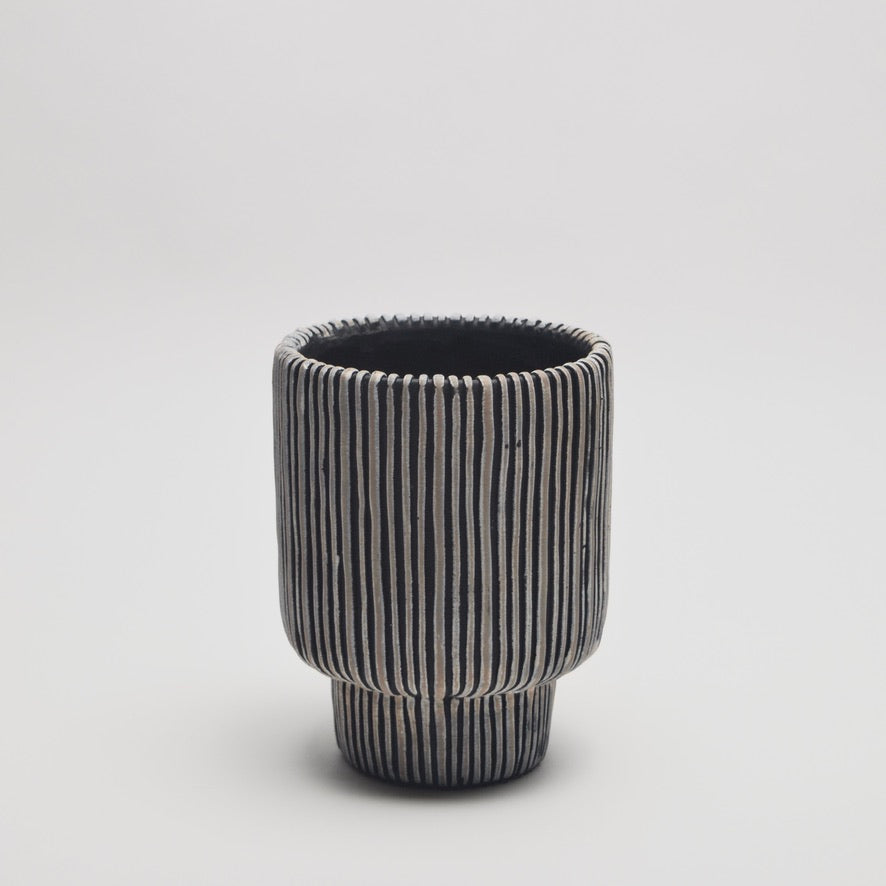 This planter has a stylish, artisanal look, with black and neutral vertical stripes that follow its attractive pedestal shape from top to bottom.