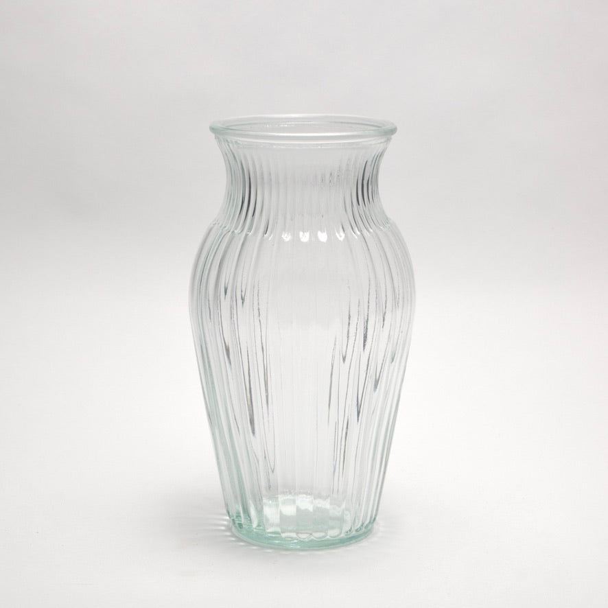 This beautiful glass vase has an elegant silhouette, accentuated by vertical fluting that follow its curves from top to bottom.