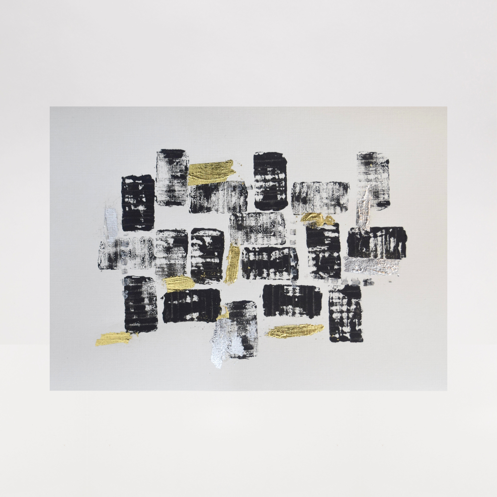 A pattern of repeating rectangles has been handprinted onto 250gsm lightly textured off-white paper. The black paint is elevated by gold and silver foiling, which creates warmth and makes the artwork more special. Each has been created individually, so slight variations will occur.