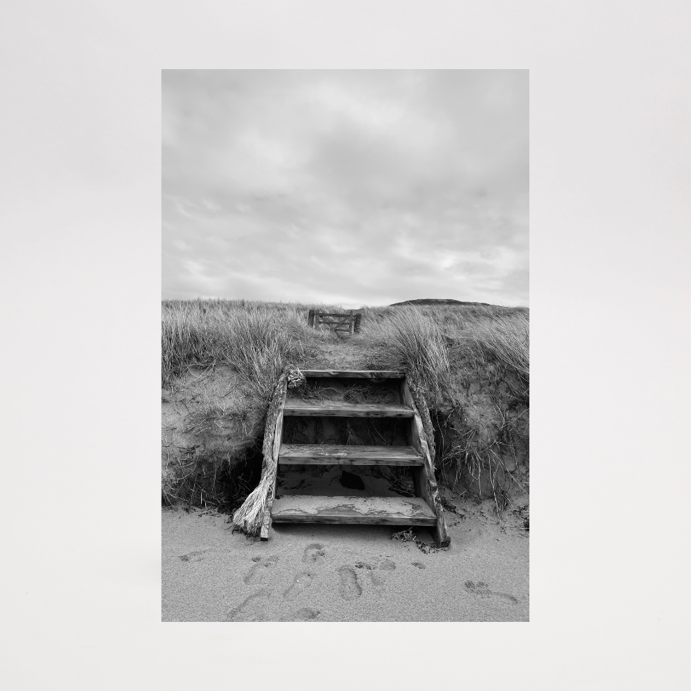 A beautiful black and white photograph captures the relaxing atmosphere of the scene, with wooden steps leading up through the long grasses that sway gently in the breeze. An original image, printed on Fujifilm photographic paper.
