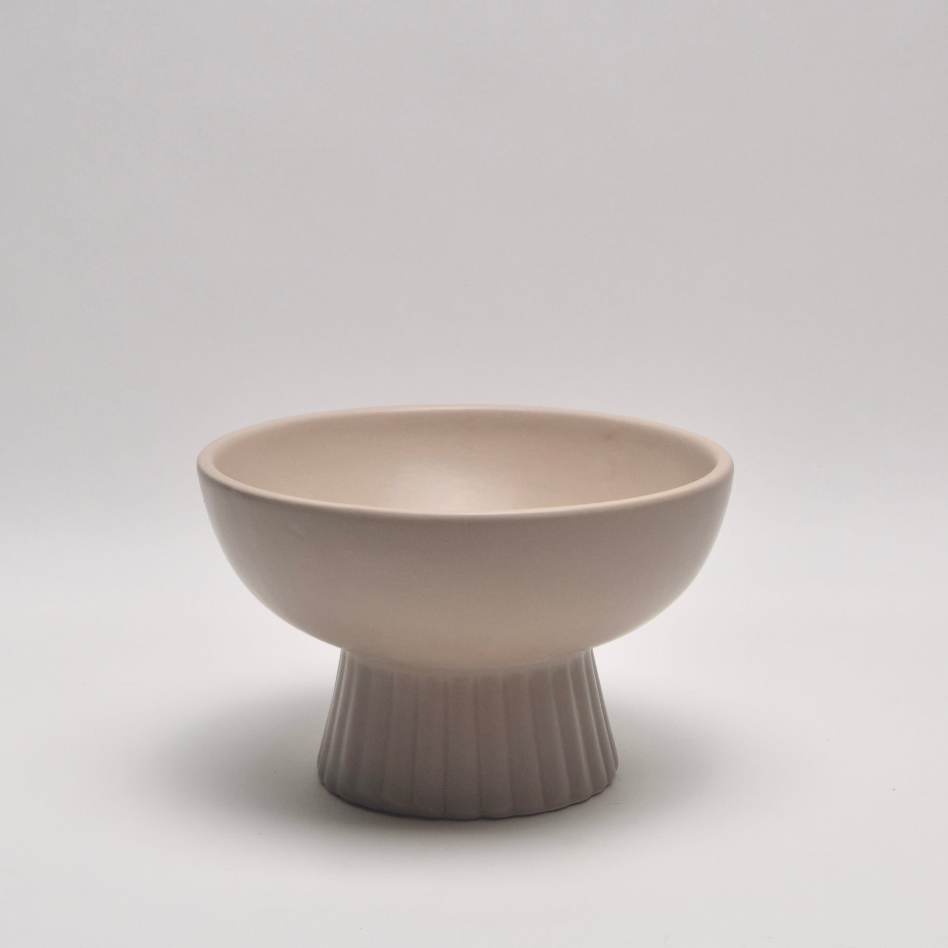 This ceramic bowl has an elegant, pedestal shape and a neutral, latte colour. The smoothness of the curved bowl contrast with the ribbed effect of the pedestal to add interest to its design.